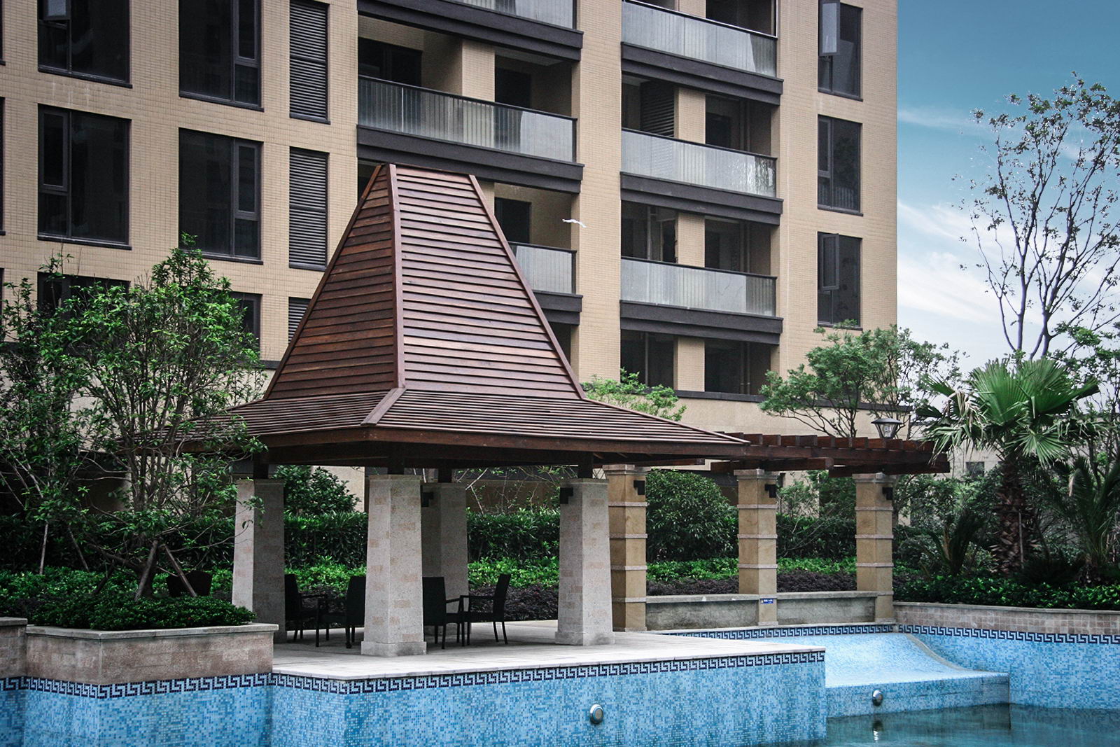 優(yōu)雅的度假泳池,每到夏令時(shí),吸引業(yè)主紛紛走出室內(nèi)空調(diào)房,投身到蔚藍(lán)水世界,放松身心。