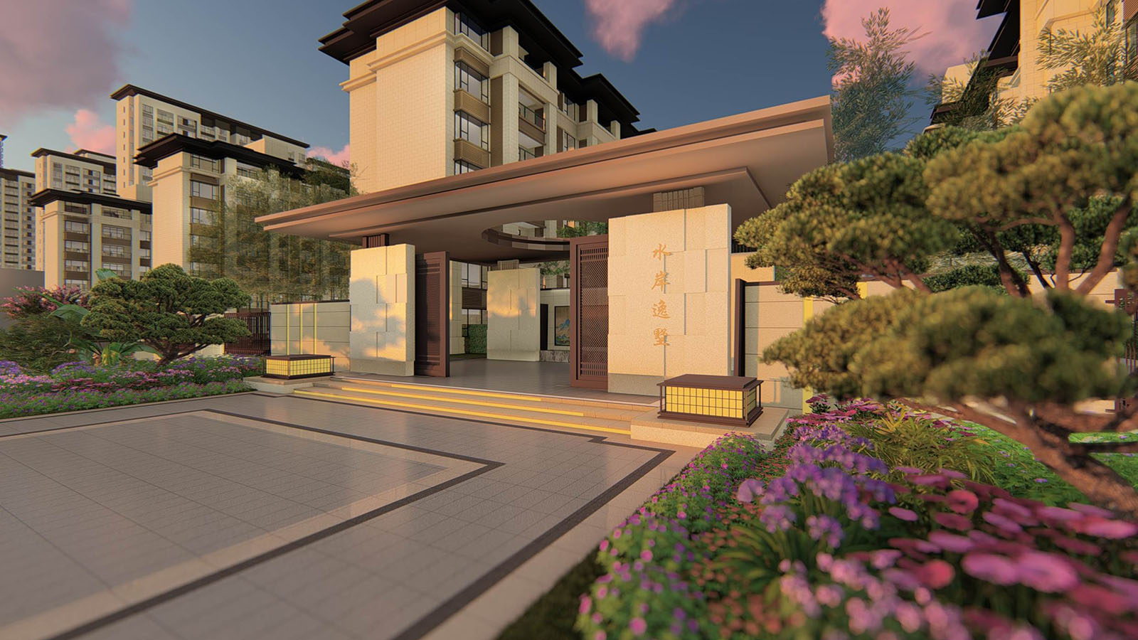 鏡面水景及景墻屏風(fēng)的脈絡(luò)肌理與地塊東側(cè)的南湖相呼應(yīng),以此與南湖·水岸逸墅案名產(chǎn)生共鳴,景觀將月印萬(wàn)川,處處皆圓為文化內(nèi)涵具象,寓意萬(wàn)川歸源,圓融無(wú)礙,精英階層的生活處事態(tài)度與精神追求。