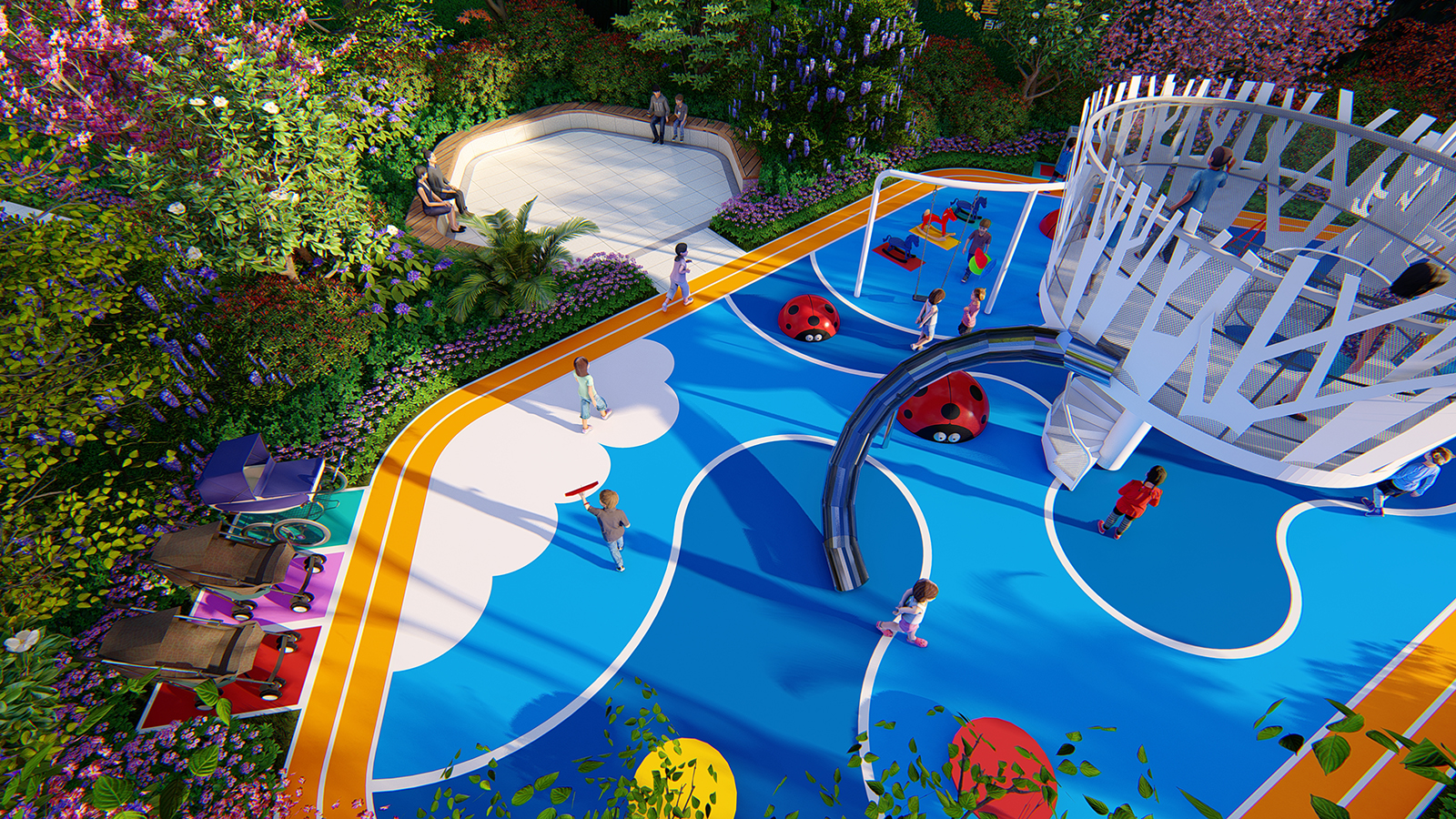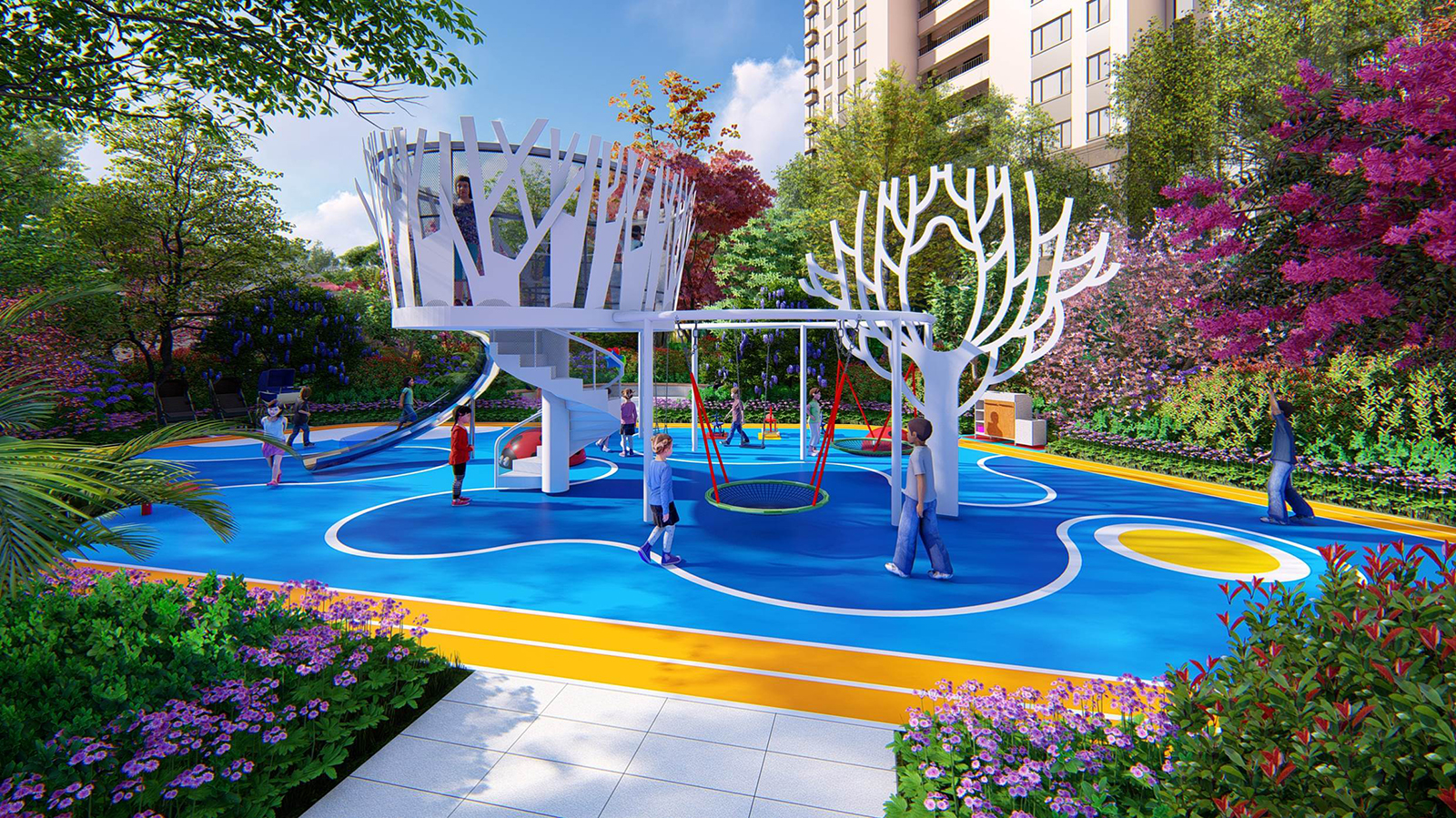 兒童樂園以親子同樂,喜鵲和鳴為意境,設(shè)置兒童體驗熱點,同時布置家長休閑看護區(qū)與洽談區(qū),園路旁的喬木夾道種植,豐富的綠化層次,都能增強客戶對項目品質(zhì)更加直觀的感受。