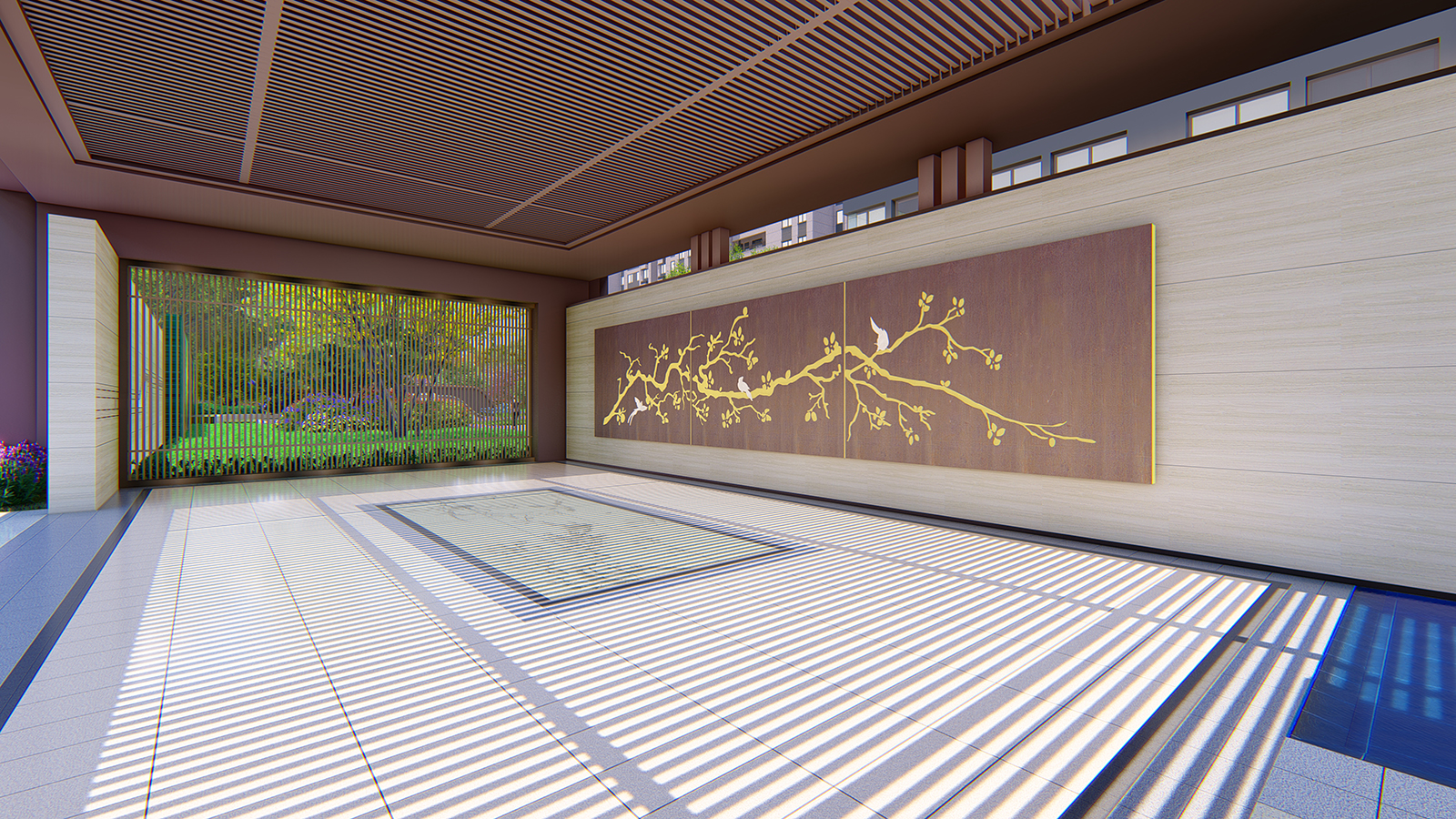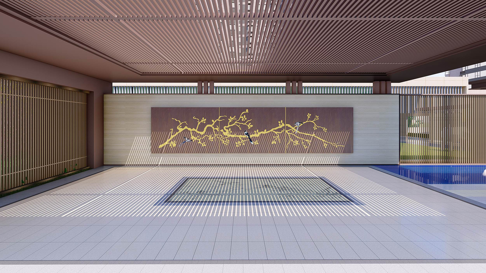 門頭對景處設(shè)置“喜上眉(梅)梢”景墻,客戶視線跟隨梅花枝條方向延伸,巧妙構(gòu)建空間遞進關(guān)系,為項目增添趣味及內(nèi)涵。
