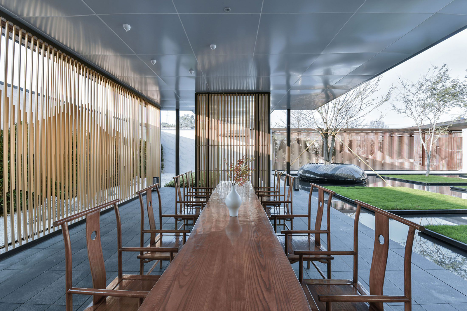 “L形”廊架給予客戶無形的引導,帶領(lǐng)客戶進入到更深層次空間,廊架頂板布置喜鵲藝術(shù)裝置,以雀幸喜歸為主題,引導賓客進入售樓部。