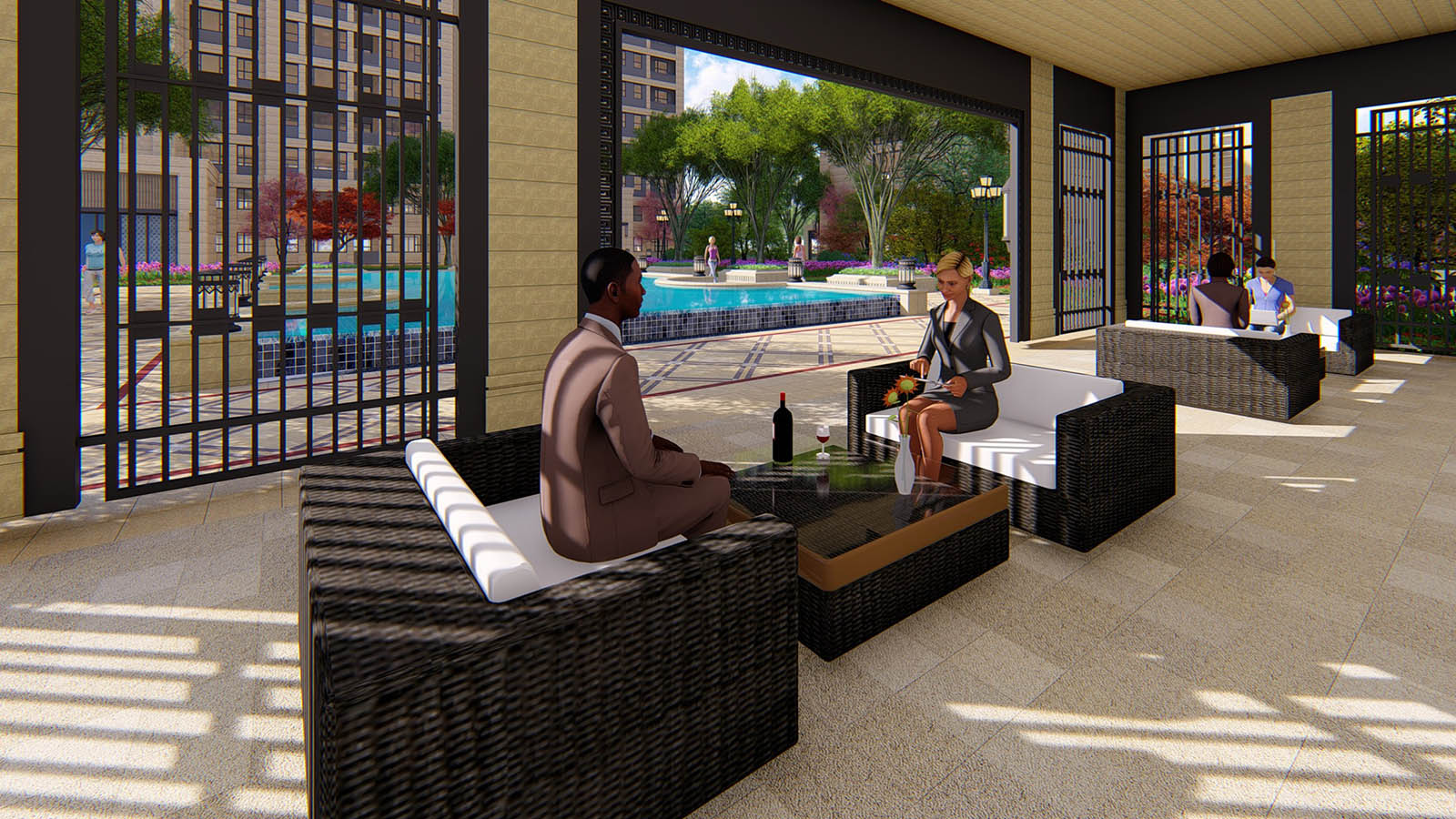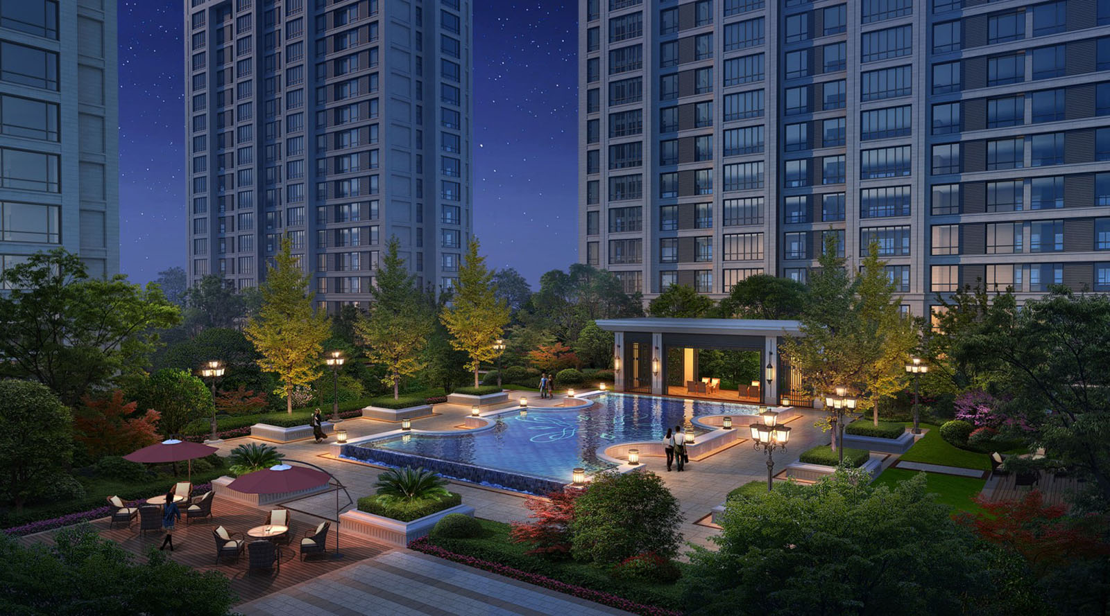 46#-48#樓宅間,為業(yè)主呈現(xiàn)最靜謐、舒心的精致鏡面水景,休閑廊架、木平臺與林蔭相伴,水面燈光優(yōu)雅、浪漫,融光和影,曼妙唯美,讓業(yè)主更加貼近自然,功能上同時作為業(yè)主會客訪友的“景觀會客廳” ,為業(yè)主打造真正的心靈居所,靜謐優(yōu)雅、詩意棲居生活。