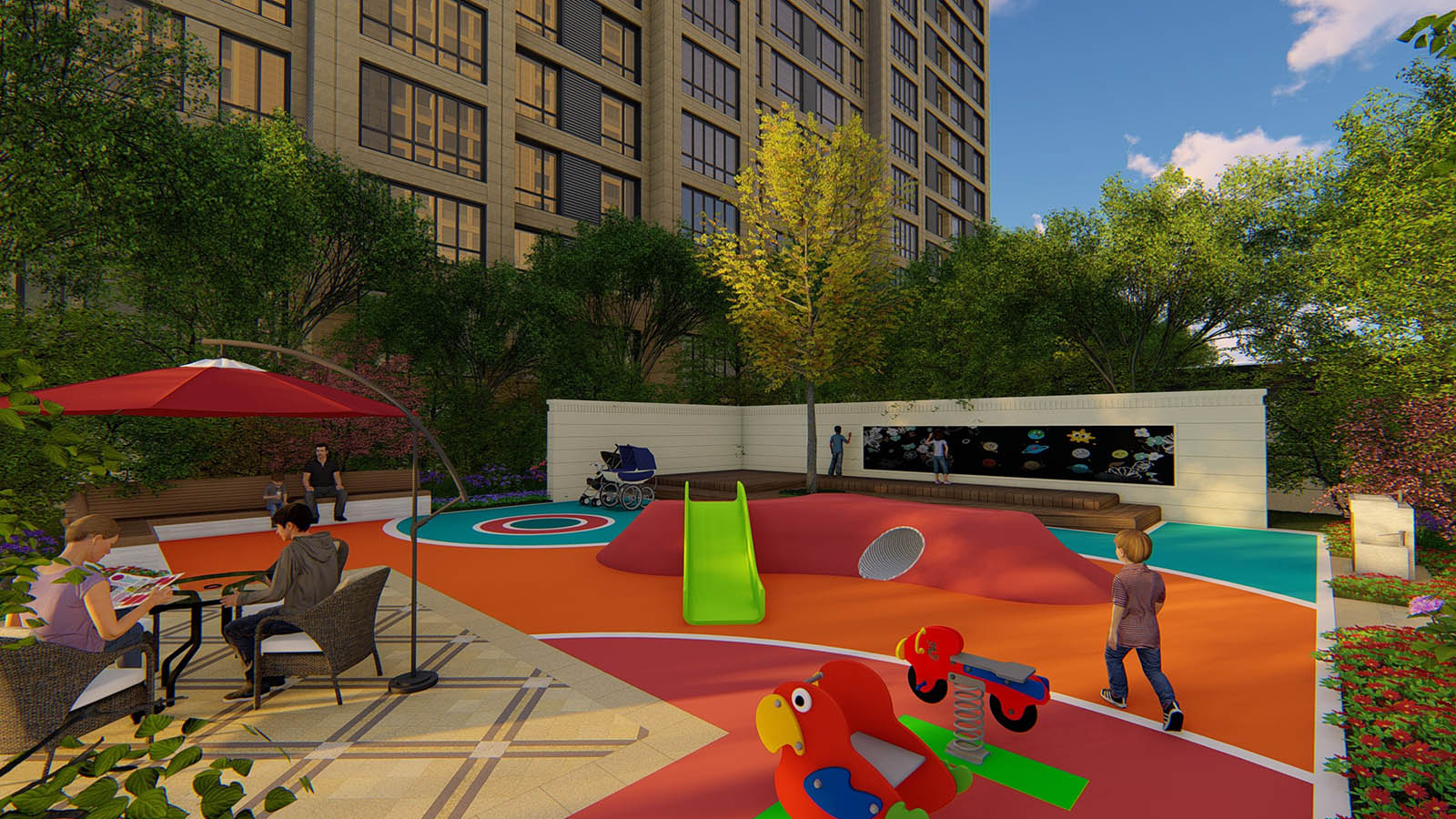 設計時深入研究各年齡段兒童的戶外活動方式與形態(tài),營造出適合2-12歲全齡兒童的人性化活動場地,兼顧家長的看護與親子互動需求,在兒童活動區(qū)旁設置成人休息區(qū),寬面座椅得以讓孩子和家長得以盡情放松休息,座椅倒角設計降低安全隱患,同時座椅高低組合排布兼具母嬰臺功能,座椅旁預留杯皿放置區(qū),并設有室外洗手池,兒童車停放位,科學系統(tǒng)的利用空間。