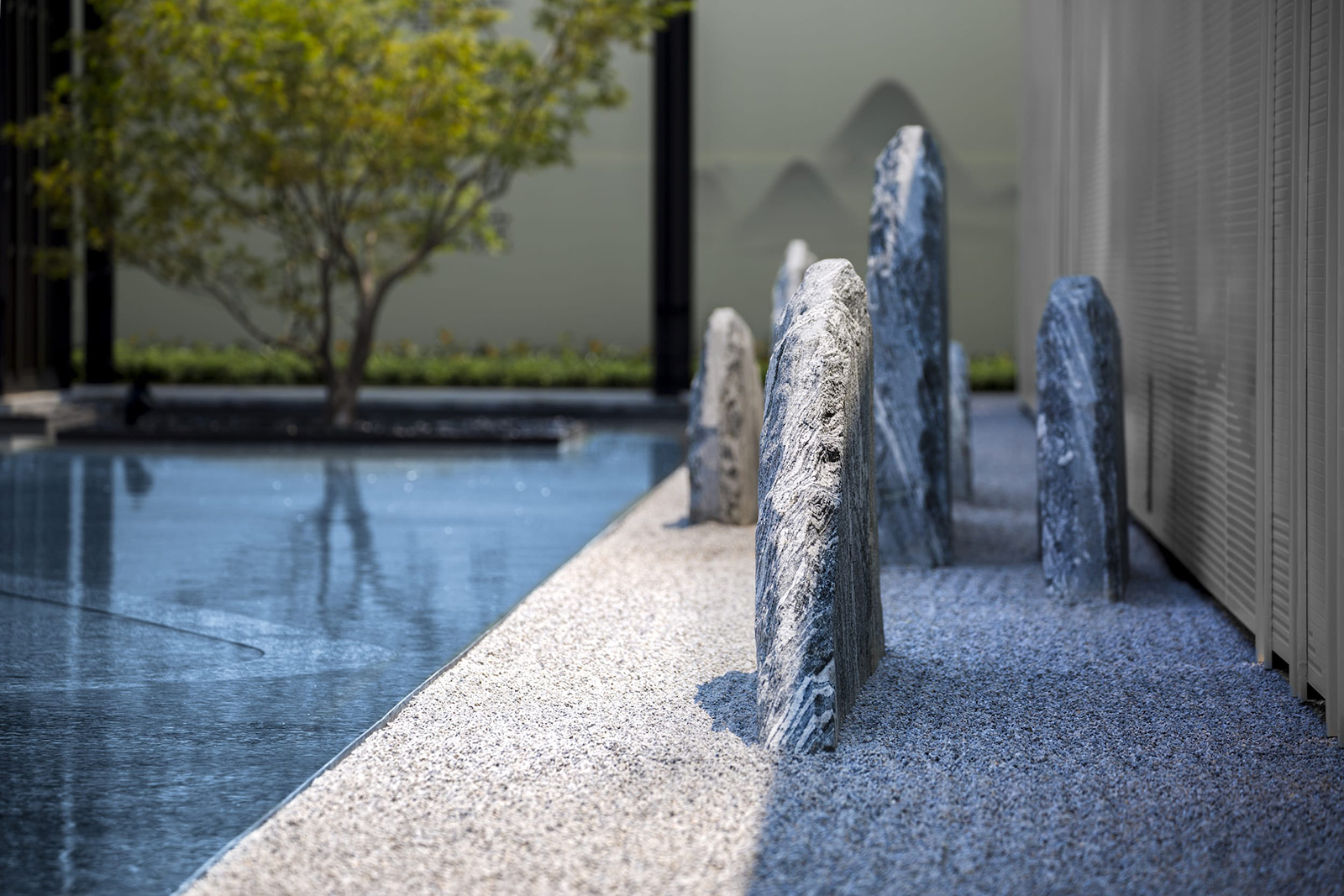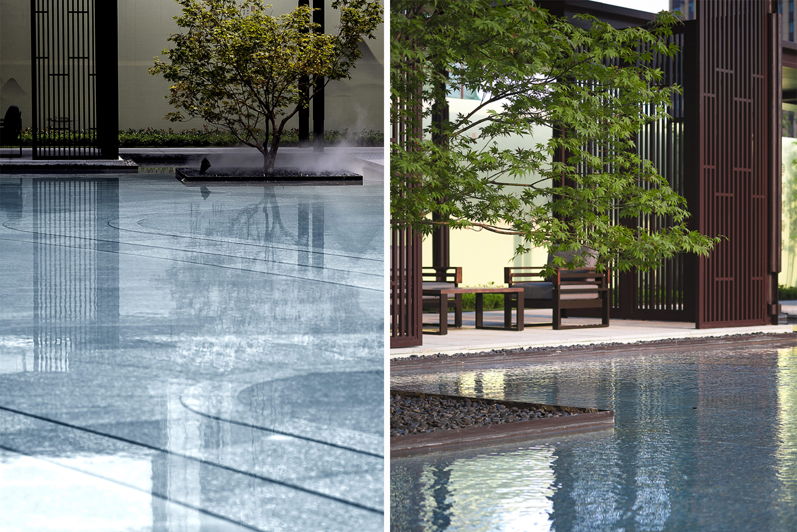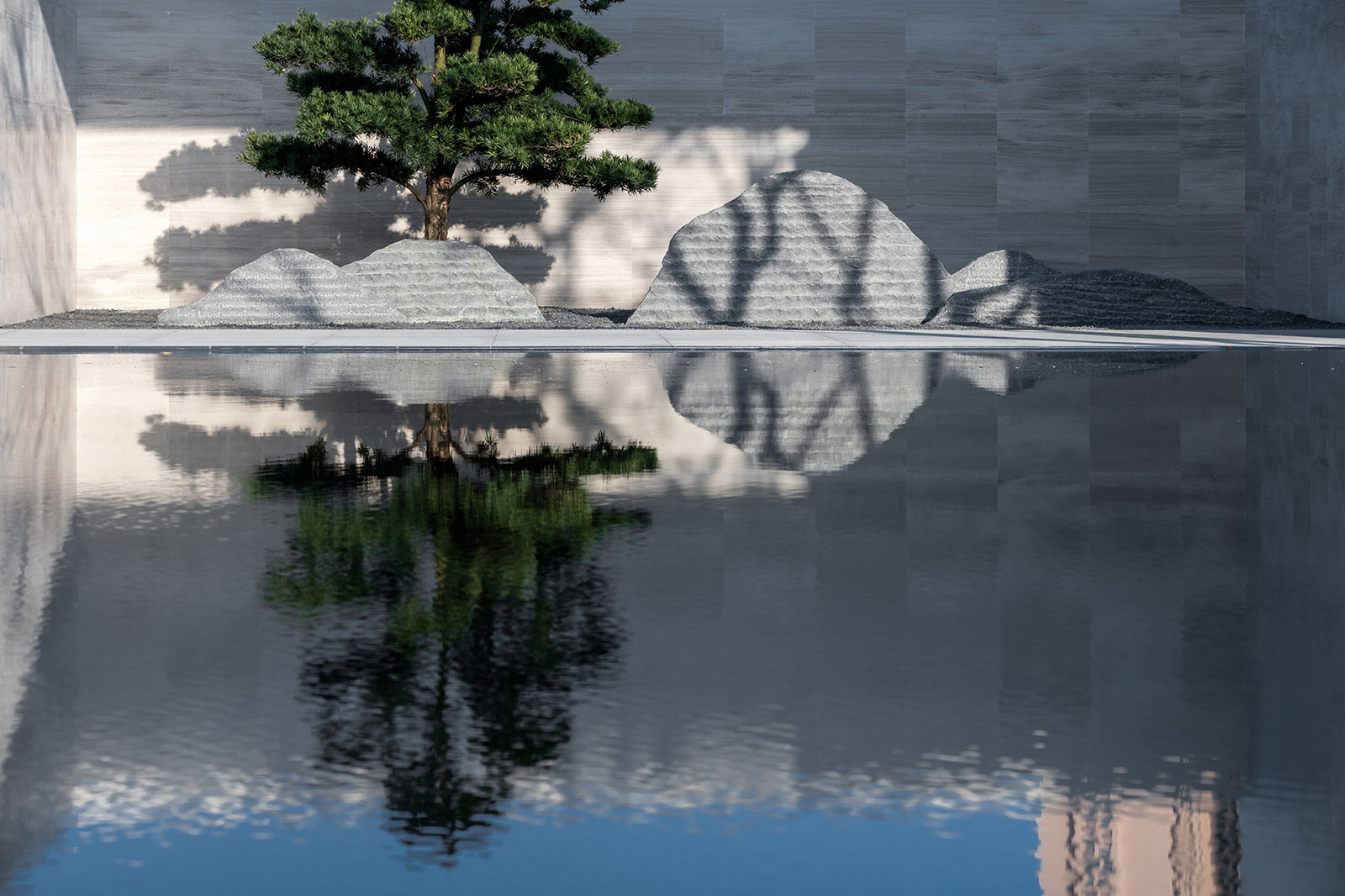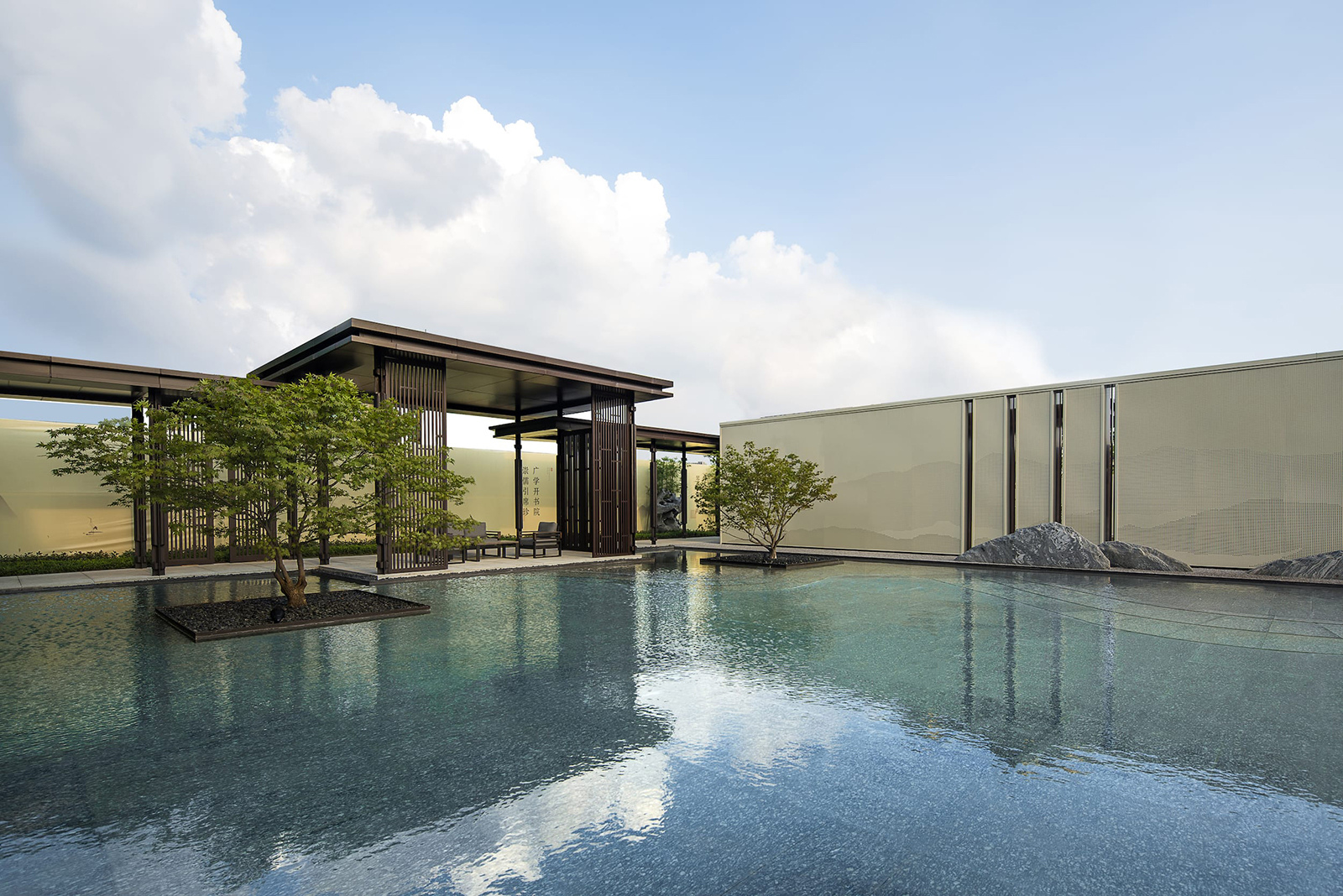 “水利萬物而不爭”,入口府門與造型景石疏導人車動線,以“迎·入境壺天,禮·天宇空明——境·圖云境水”為展示序列,層層遞進??伤^“入則壺天自春”,清凈悠然。對景景墻巍峨大氣,通過風雨連廊,見中軸線大尺度水景,如銀河望月,藏風納氣。水景曲線如群山往復,流水潺潺,禮儀燈光步道,靜謐舒心,大氣、精致、從容。